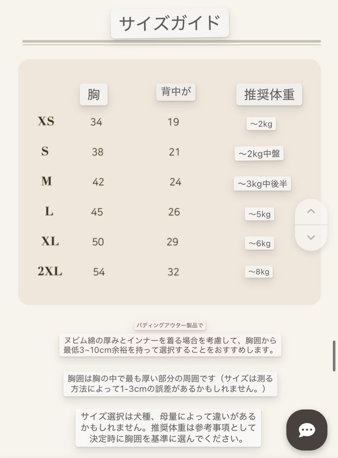 ・パディングの厚みとインナーを着る場合を考慮して胸囲からゆとりを持って選択することをおすすめします。