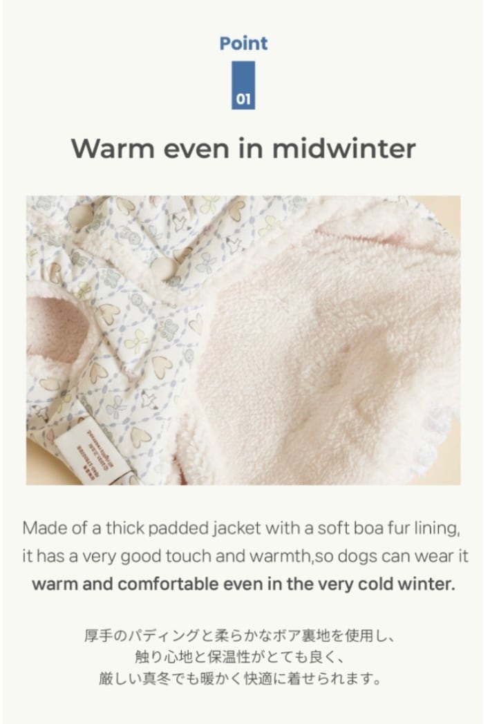 厚手のパディングと柔らかなボア裏地を使用し、触り心地と保温性がとても良く、真冬でも暖かく快適に着ることができます♩