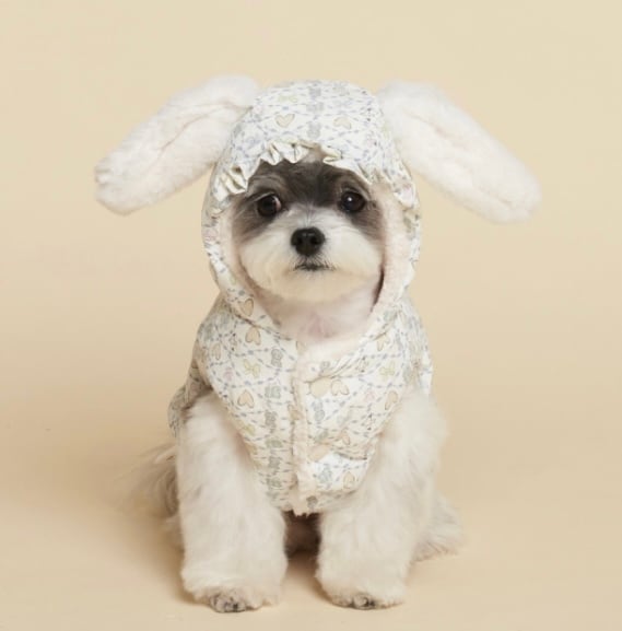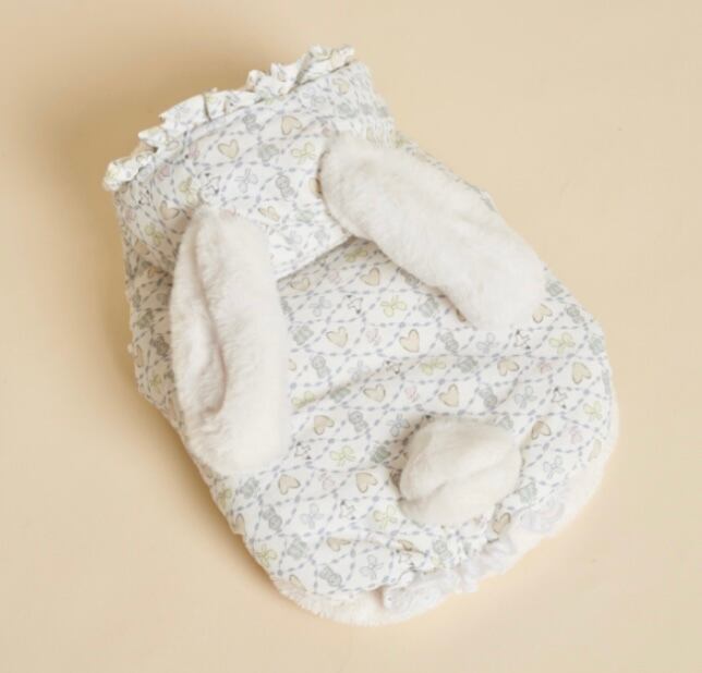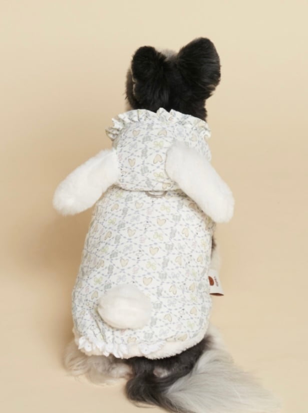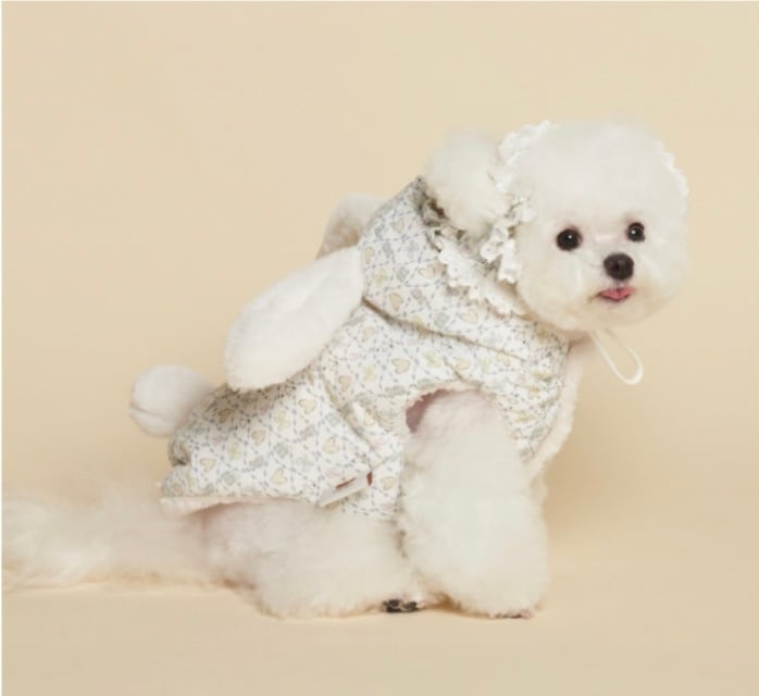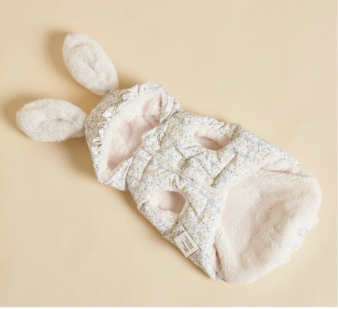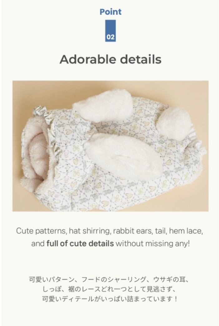 うさぎの耳、しっぽ、フードのシャーリング、裾のレース、甘いパステル模様…可愛いデティールがいっぱい詰まったパディング♡