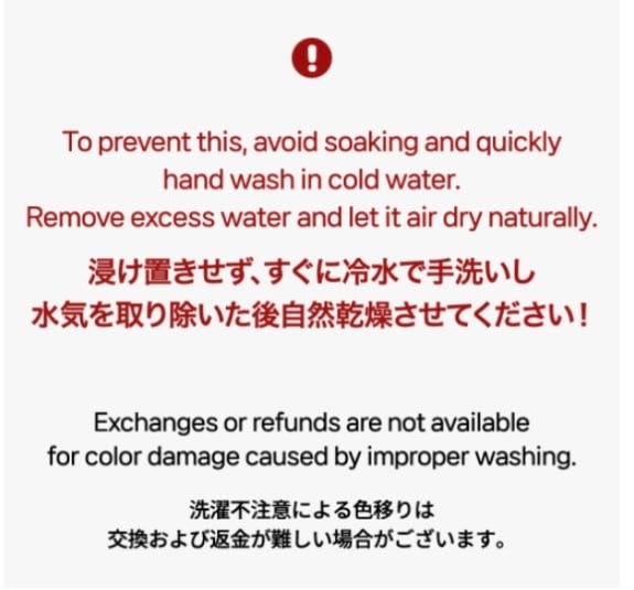 ・浸け置きせず、すぐに冷水で手洗いし、水気を取り除いた後自然乾燥させてください。