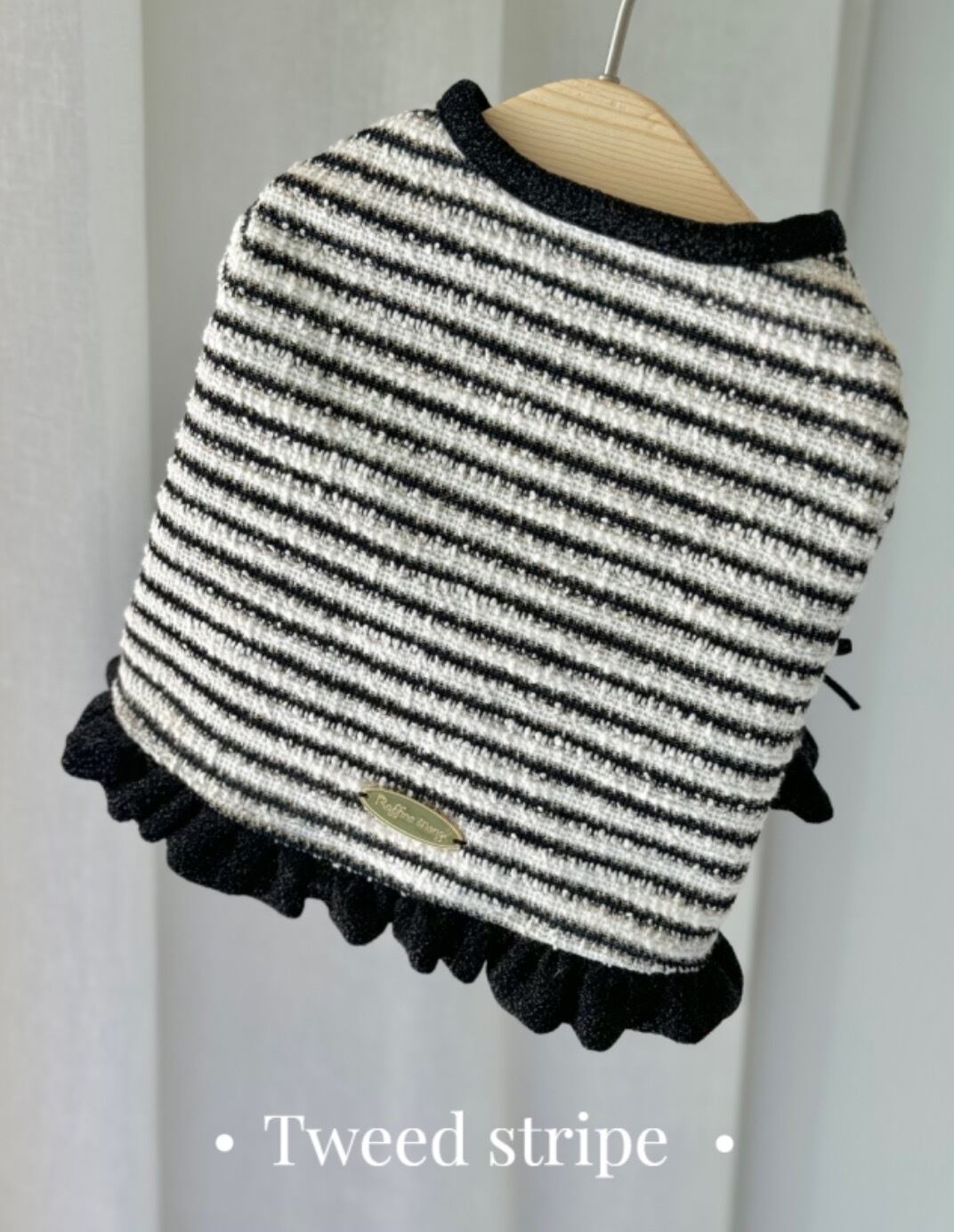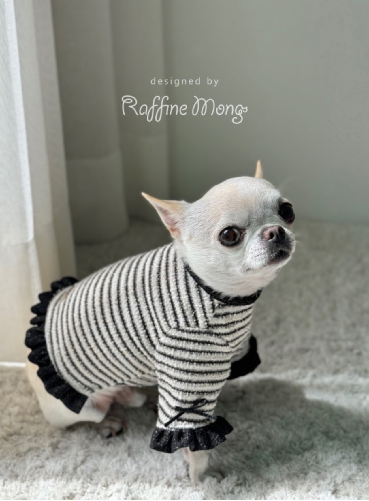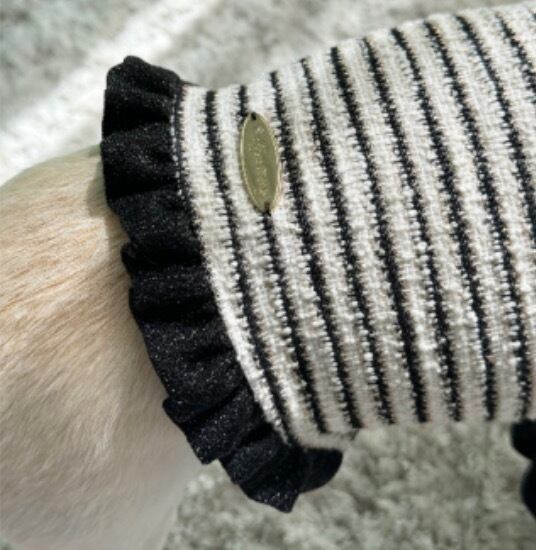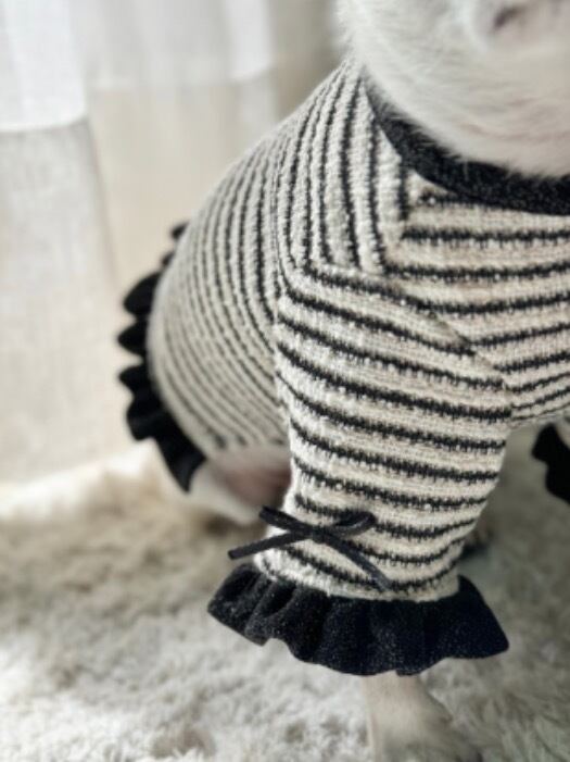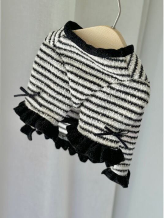 袖と裾にはブラックのフリルで可愛く、ストライプにはほのかにゴールドが織り込まれ、カジュアルながらも華やかさのあるトップスです♩